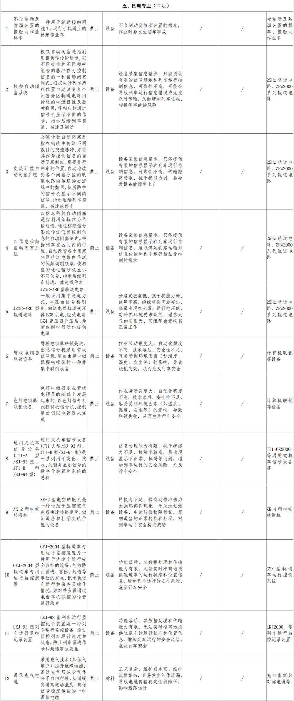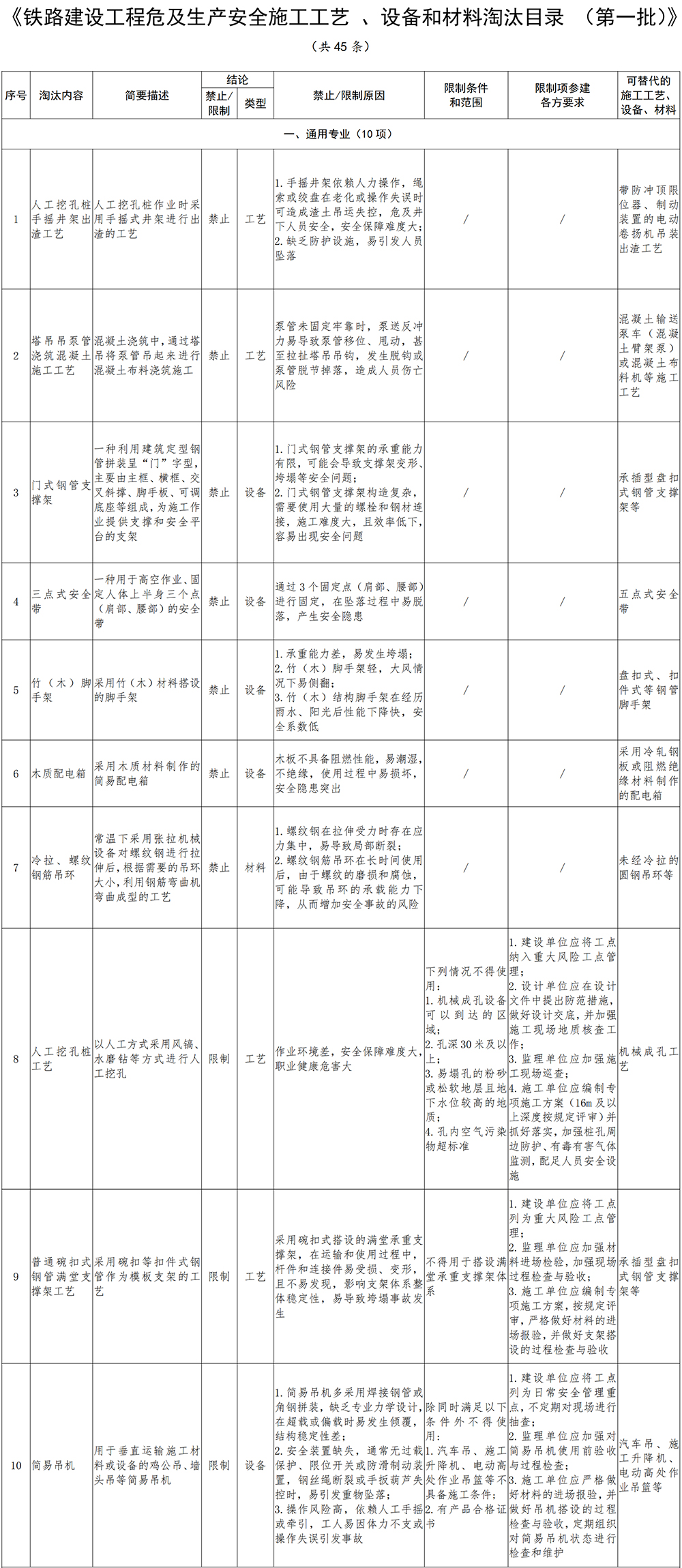 為防范化解鐵路重大事故隱患,推動(dòng)鐵路建設(shè)領(lǐng)域淘汰落后工藝、設(shè)備和材料,提升本質(zhì)安全水平,根據(jù)《中華人民共和國(guó)安全生產(chǎn)法》《建設(shè)工程安全生產(chǎn)管理?xiàng)l例》等法律法規(guī),國(guó)家鐵路局組織制定了《鐵路建設(shè)工程危及生產(chǎn)安全施工工藝、設(shè)備和材料淘汰目錄(第一批)》(以下簡(jiǎn)稱《淘汰目錄》),現(xiàn)予發(fā)布。
