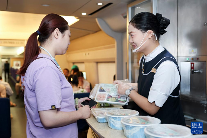 7月1日,長(zhǎng)三角鐵路上的餐飲服務(wù)員為旅客介紹新品餐食。