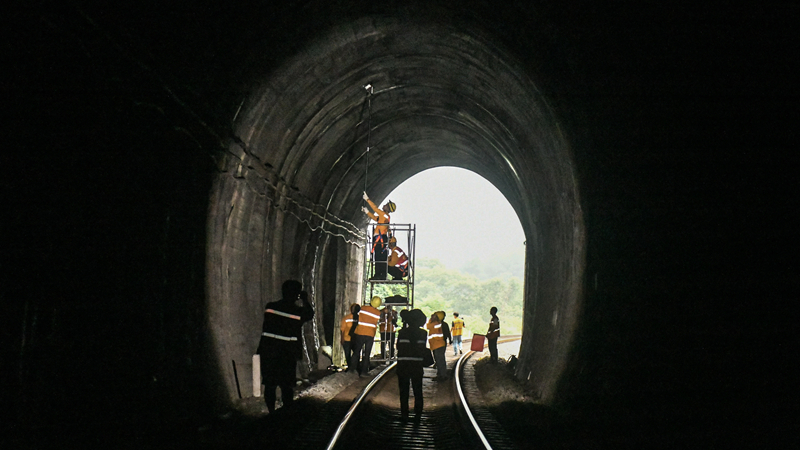 暑運(yùn)期間,在湘桂鐵路(廣西段)沿線,國鐵南寧局桂林工務(wù)段13名橋隧工人日夜穿梭于桂北的崇山峻嶺間,對(duì)管段內(nèi)的10座隧道、1075座涵洞進(jìn)行多維度巡檢、排查隱患,確保湘桂鐵路線上暑運(yùn)客貨列車安全運(yùn)行。