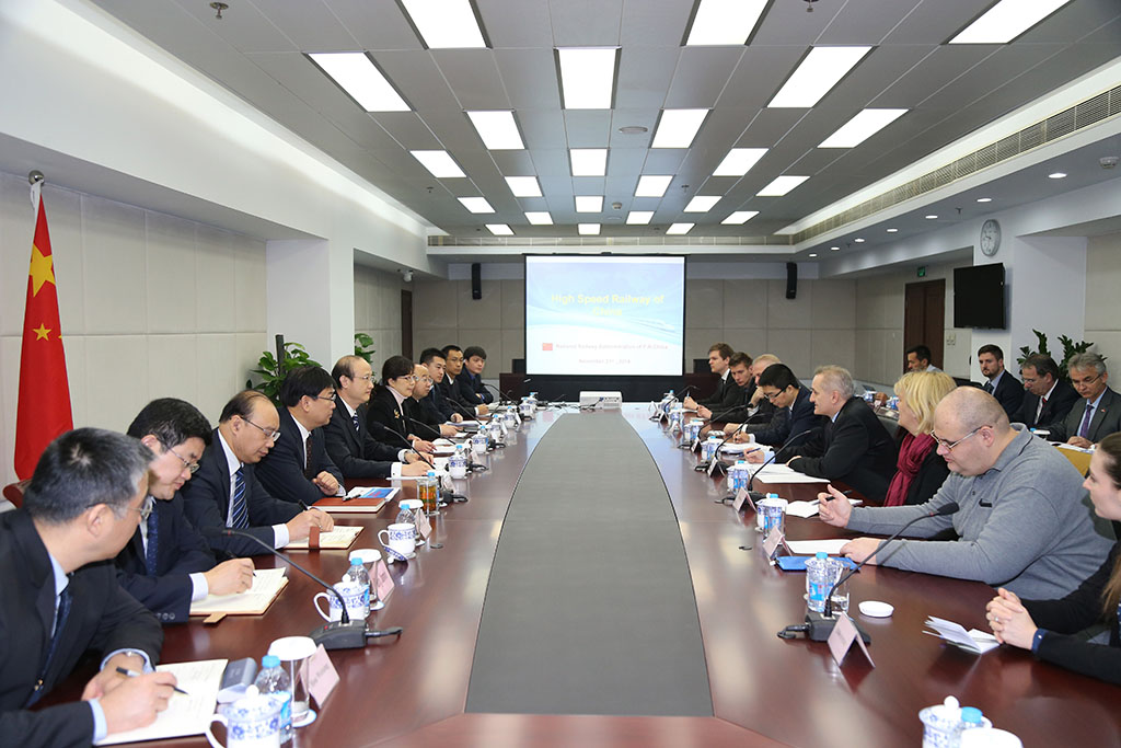 11月21日,國家鐵路局黨組成員鄭健(左五)在北京會(huì)見了以塞爾維亞國際政治經(jīng)濟(jì)研究所所長迪米特里耶維奇(右四)為團(tuán)長的中東歐智庫學(xué)者考察團(tuán)。