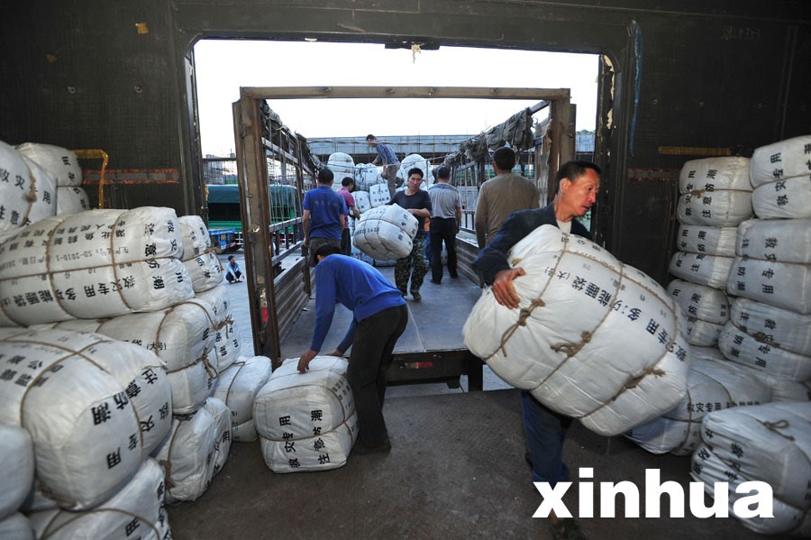 西藏地區地震災情發生后,鐵路部門按照“優先裝車、優先掛運、優先編組、優先開行”的原則,以最快的速度、最短的時間開行救災專列。圖為4月26日21時50分,武漢鐵路局衛家店車站職工正在搶裝開往拉薩西站的95002次救災專列。(來源:新華社)