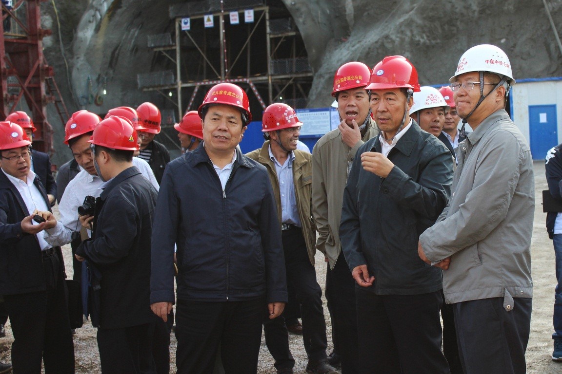 圖為局黨組成員、副局長傅選義(前右二)檢查武九客專李家莊隧道施工現場。