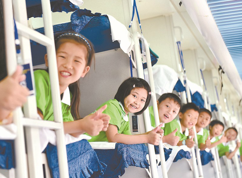 暑期,80余名來自重慶市綦江區(qū)的留守兒童乘坐K201次列車前往廣州與父母團(tuán)聚。列車工作人員對(duì)他們一路重點(diǎn)照顧,并開展互動(dòng)表演等活動(dòng),車廂內(nèi)充滿了歡聲笑語(yǔ)。圖片攝影:余中華