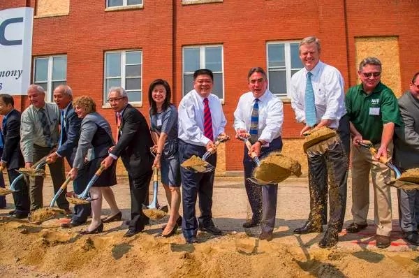 9月3日,中國中車股份有限公司美國馬薩諸塞州斯普林菲爾德生產基地舉行奠基儀式。這是中國軌道交通設備制造商首次在發達國家投資建廠,也是中國生產的地鐵機車首次打入有著嚴苛安全技術標準的美國市場。這標志著中國鐵路裝備行業正在從產品輸出向資本輸出、技術輸出,從產品合作向產品、技術、服務、管理全方位合作的轉變。圖為出席中國中車股份有限公司在美制造基地奠基儀式的嘉賓鏟土奠基。