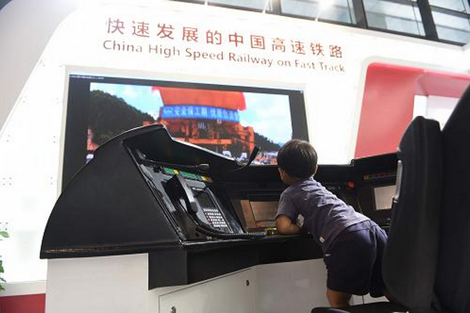 9月18日,在廣西南寧舉辦的第12屆中國—東盟博覽會上,位于1號館1號展位的“快速發展的中國高速鐵路”展臺格外引人注目。這是中國高鐵展首次亮相中國—東盟博覽會,向東盟國家集中展示了中國鐵路創新發展歷程和中國高鐵現代化技術裝備,受到各國政要、貴賓、客商以及媒體記者的高度關注和熱捧。小朋友坐進模擬艙體驗駕駛動車。攝影: 新華社記者黃孝邦