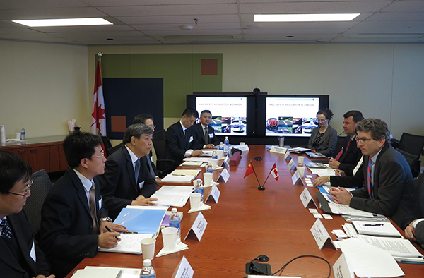 當地時間4月16日至23日,國家鐵路局局長陸東福應邀率團訪問加拿大、美國。訪問期間,分別與加拿大交通部副部長邁克爾˙基南,加拿大運輸署、加拿大運輸安全委員會等單位負責人舉行了會談;與美國聯邦鐵路署署長薩拉˙范博格共同主持了鐵路工作組會議。中方系統介紹了中國鐵路規劃、建設和運營情況以及中國高速鐵路發展成就和優勢,就鐵路改革發展、行業監管、市場化運營、高速鐵路合作以及推動鐵路合作交流機制化建設等問題與外方深入交換了意見。中國駐加拿大使館、駐美國使館有關人員參加了會議。陸東福一行還到加拿大國家研究理事會、加拿大鐵路客運公司、加拿大國家鐵路公司、加拿大溫哥華太平洋中央車站、加拿大蒙特利爾至渥太華客運列車以及美國聯合太平洋鐵路公司芝加哥貨運樞紐等地考察調研。圖為陸東福局長(左三)與加拿大交通部副部長邁克爾˙基南(右一)會談。
