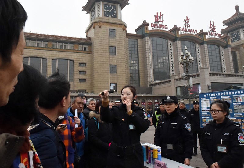 北京鐵路警方在北京站廣場開展安檢宣傳活動,安檢員向旅客講解禁止攜帶乘車的危險物品種類,防止易燃易爆等危險物品上車。唐召明 攝