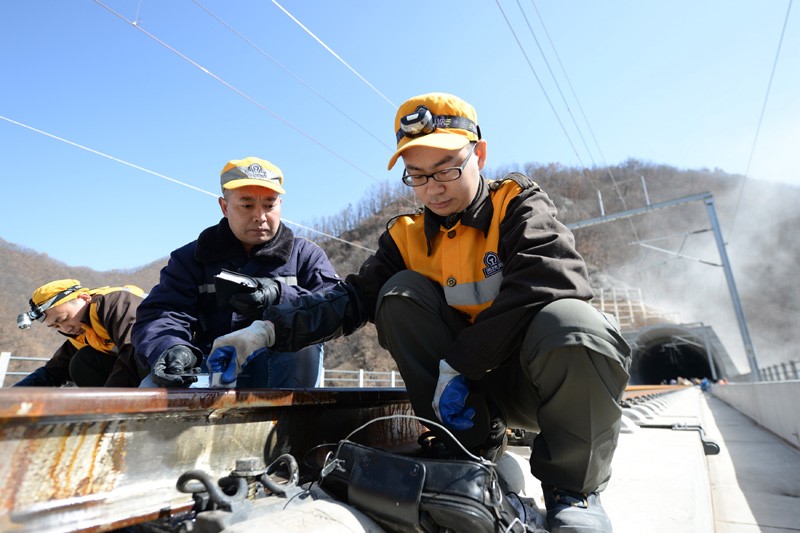工作人員在寶蘭高鐵陜西段庵平東溝大橋上對(duì)鋼軌進(jìn)行探傷檢測。