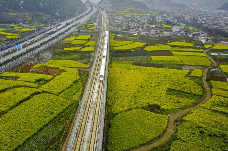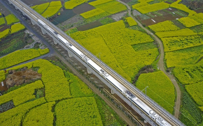 近日,貴州安順油菜花開,高鐵列車穿行其間,構成一幅幅美麗圖畫。圖為3月16日,一列動車組列車在滬昆高鐵貴州安順段行駛。