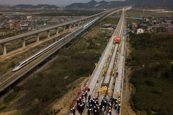 中鐵四局施工技術人員在傳芳特大橋上進行杭黃鐵路的鋪軌作業,一列高鐵從旁邊的滬昆客運專線上駛過。