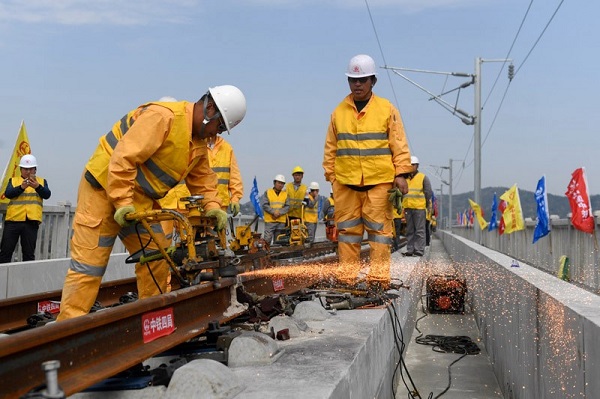 3月12日,在浙江省杭州市蕭山區的傳芳特大橋上,中鐵四局順利鋪下最后一對500米長鋼軌,鋁熱焊機完成最后一對軌頭焊接,標志著杭州至黃山鐵路客運專線軌道全線貫通。