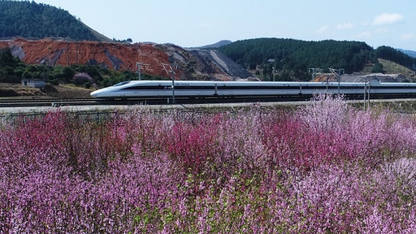 在貴州省凱里市,鐵路旁邊春花開(kāi)放,動(dòng)車組列車行駛在芬芳中。吳吉斌 攝