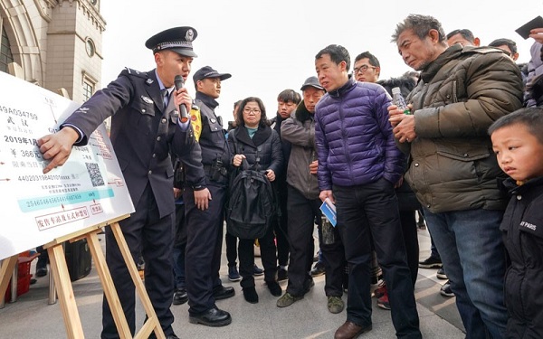 武漢鐵路公安處在漢口火車站舉行警營開放日活動,為旅客講解真假火車票辨識方法。