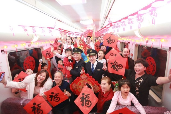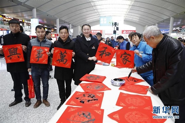 山東濟(jì)南西站職工和旅客手舉“家和萬事興”的書法作品合影留念。(來源:新華社)