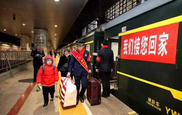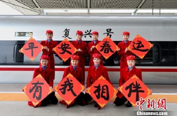 合肥客運段工作人員在G266次列車上為旅客送“?!弊帧#▉碓矗盒氯A社)