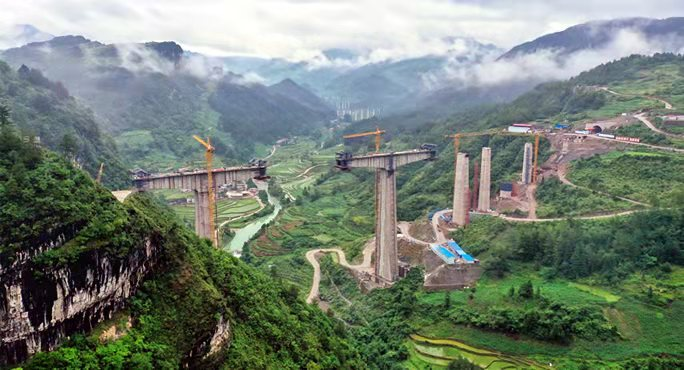 目前,貴(貴陽)南(南寧)高鐵施工進展順利。貴南高鐵設計時速350千米,是我國“八縱八橫”高速鐵路主通道包頭至海口通道的重要組成部分。圖為位于貴州省貴定縣的桐子園雙線特大橋施工現場。
