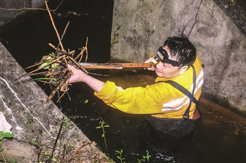 永州工務段職工連夜清理倒虹吸中的雜物。