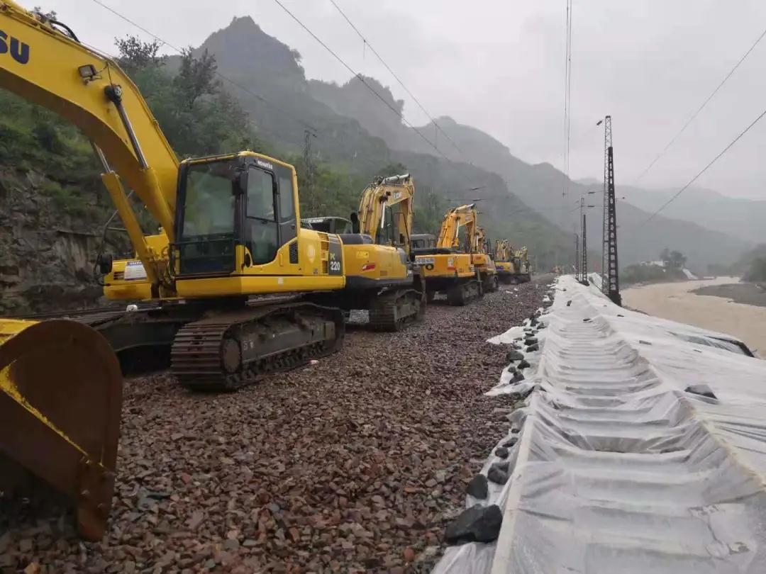 為應對強降雨,太焦鐵路搶險工程部門組織挖掘機迅速清理河道擁堵路段,降低河床水位,合理引流雨水。