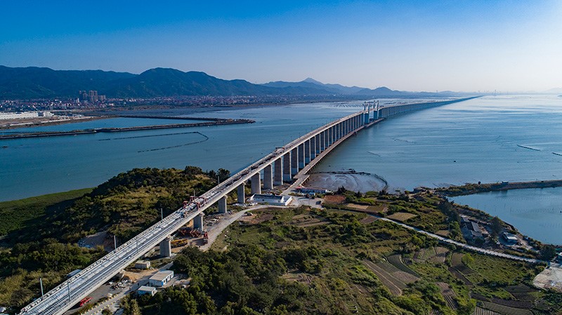 4月9日,新建福廈鐵路湄洲灣跨海大橋無(wú)砟軌道施工完成,為后續(xù)鋪軌貫通和通車運(yùn)營(yíng)創(chuàng)造了有利條件。新建福廈鐵路湄洲灣跨海大橋位于福建省莆田市及泉州市境內(nèi),全長(zhǎng)14.7公里,其中海域施工長(zhǎng)度10.8公里。圖為建設(shè)中的新建福廈鐵路湄洲灣跨海大橋。