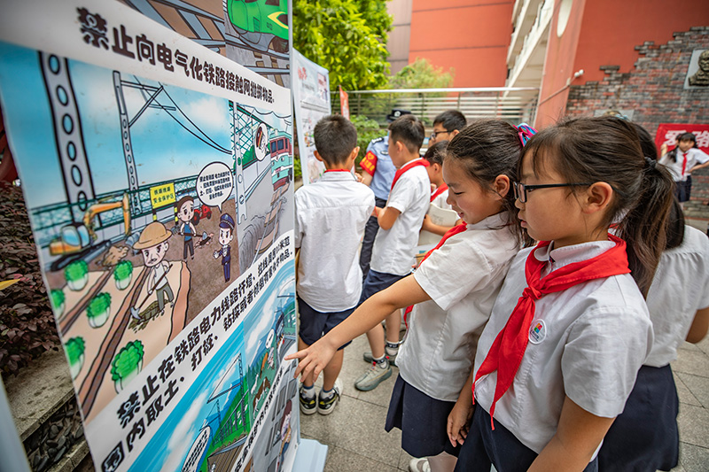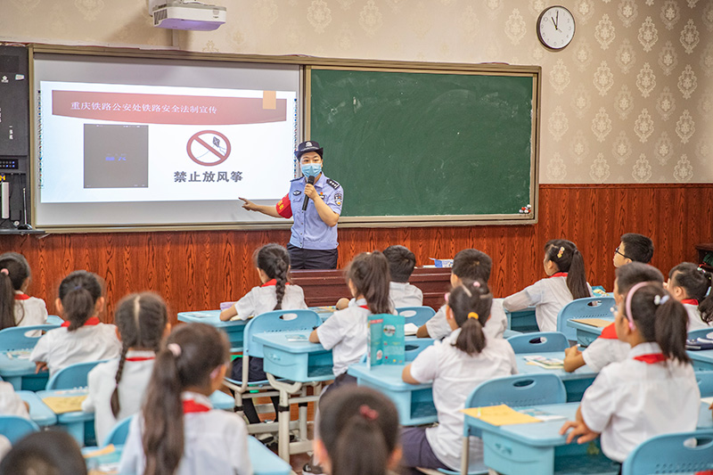 在重慶兩江新區人和小學,來自重慶鐵路公安處的普法宣傳志愿者在給學生們講解鐵路相關的法律法規。