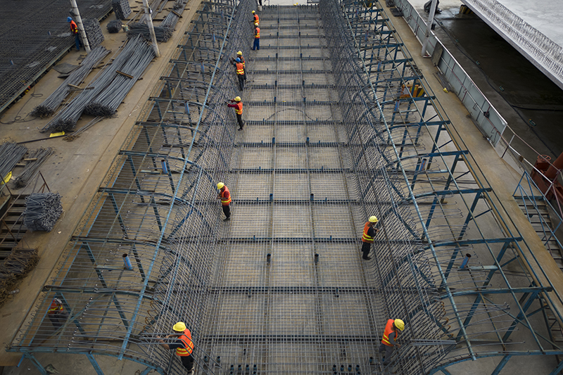 工人在哈伊高鐵鐵伊段先行工程跨S207省道2號特大橋