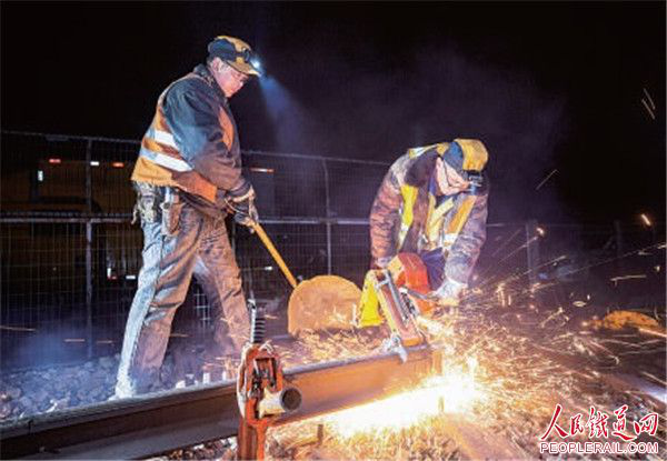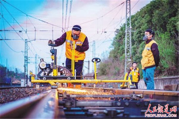 近日,宜昌綜合維修段打磨專班職工在焦柳線下行枝城站站內(nèi)進行鋼軌打磨作業(yè)。 聞子豪 攝