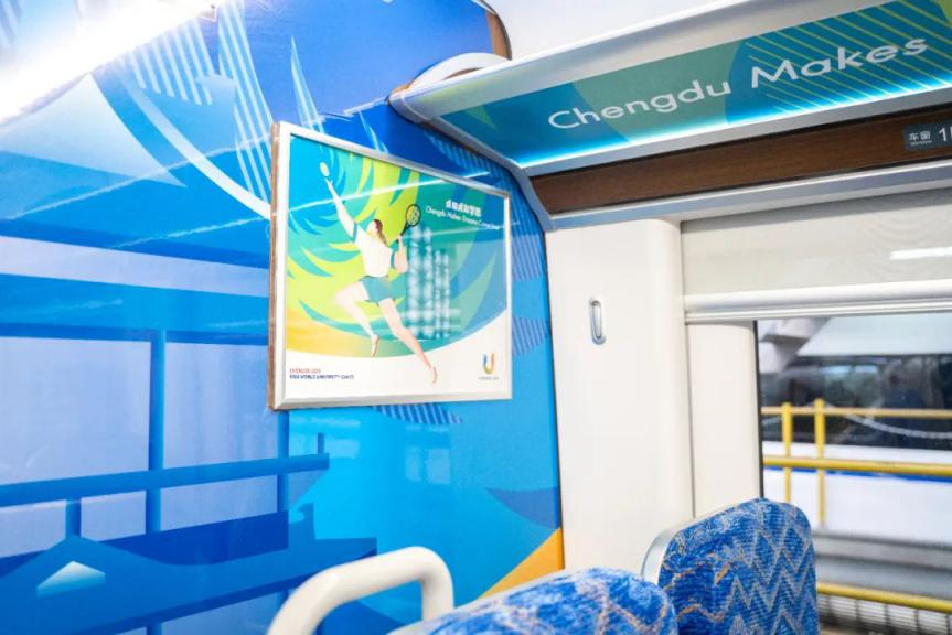 列車采用大運會元素涂裝,彰顯成都青春靚麗迎大運的風采。外觀是大熊貓和運動健兒奔跑的卡通形象,活力四射、充滿動感;內部選用清爽的深藍底色,車門貼、行李架裝飾貼、頭巾片上有許多奔跑、揮拍、投籃的形象,色彩明快、格外醒目。此次大運會期間共有兩組“大運號”旅游主題列車在成渝高鐵和成都市域環線亮相運行。
