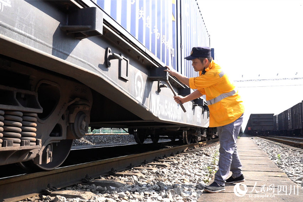 “鎖頭指向正確,車鉤、車輪、閘瓦都沒(méi)有問(wèn)題。”編組站內(nèi),中國(guó)鐵路成都局集團(tuán)有限公司成都北車輛段成都北上行運(yùn)用車間技術(shù)員劉偉正在對(duì)已完成編組的集裝箱平車進(jìn)行檢查。
