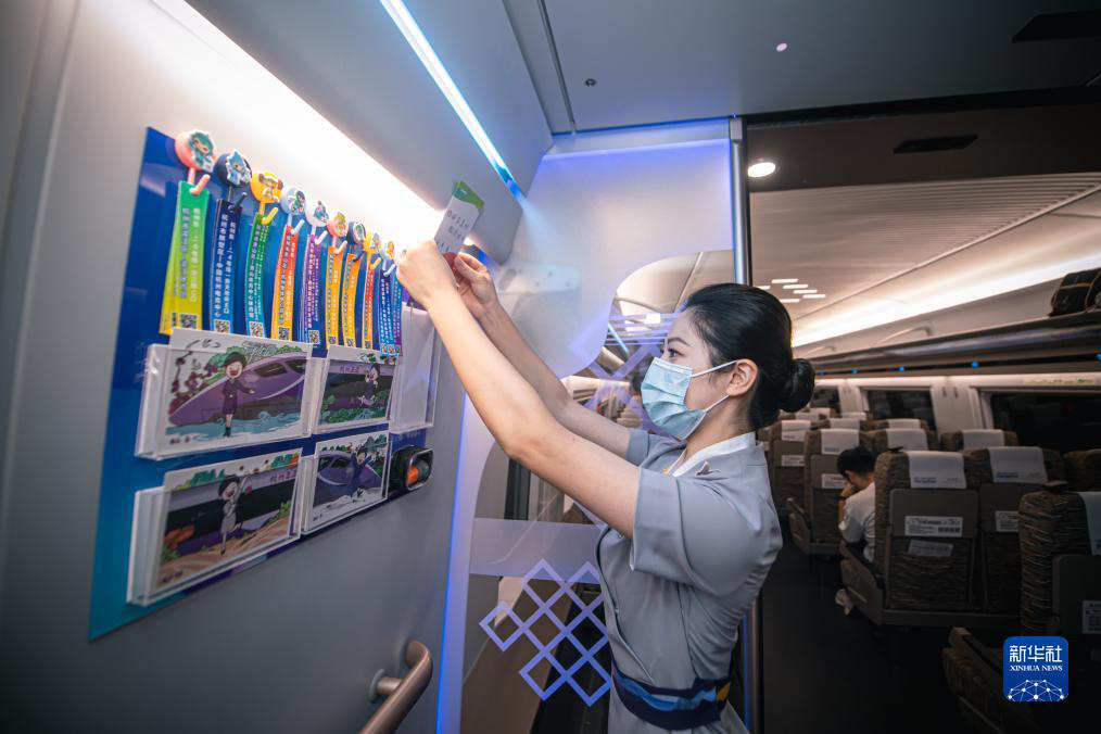 | 復(fù)興號亞運智能動車組列車上設(shè)立了亞運文創(chuàng)角,為乘客免費提供明信片等文創(chuàng)紀(jì)念品。圖為乘務(wù)員為亞運文創(chuàng)角補充產(chǎn)品。 |