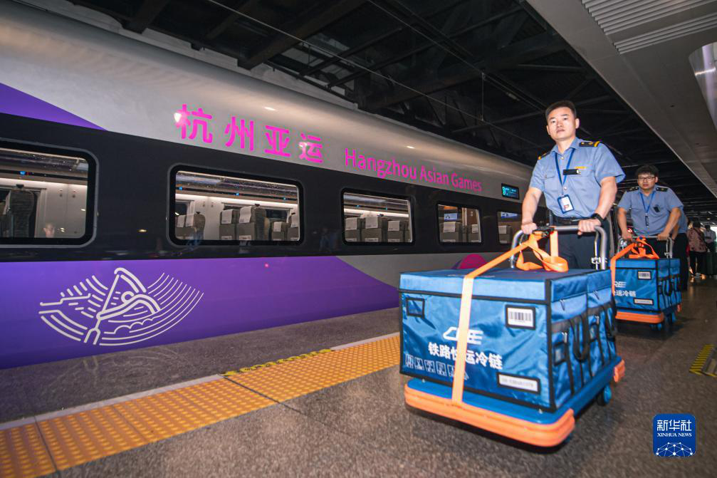 | 中鐵快運工作人員準(zhǔn)備將冷鏈運輸?shù)暮贾輥嗊\會興奮劑檢查樣本運上復(fù)興號亞運智能動車組列車。 |