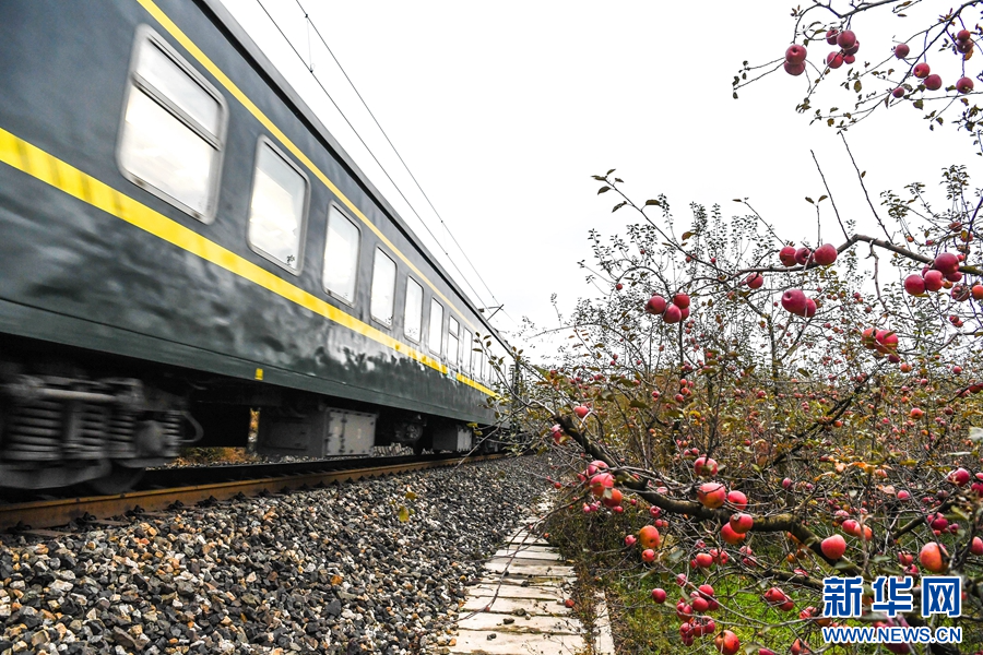 云南省昭通市昭陽區(qū),一列綠皮火車從小龍洞村的蘋果園旁駛過。