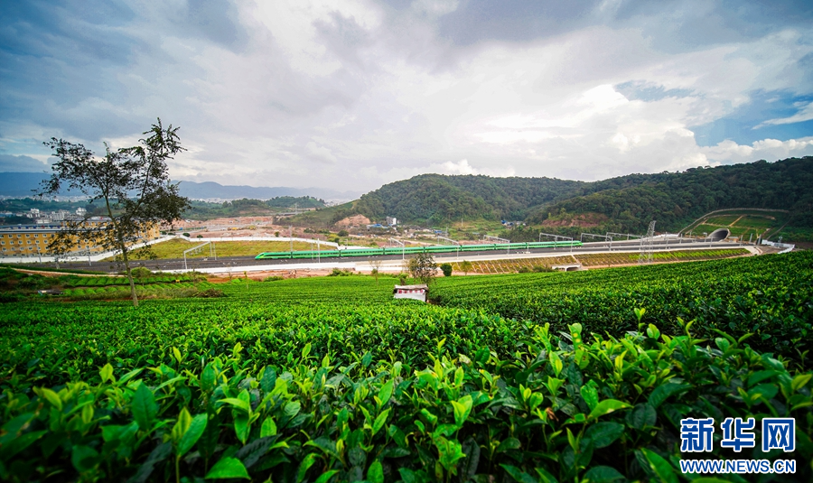 云南省普洱市思茅區(qū),復興號動車與一片茶園“同框”。