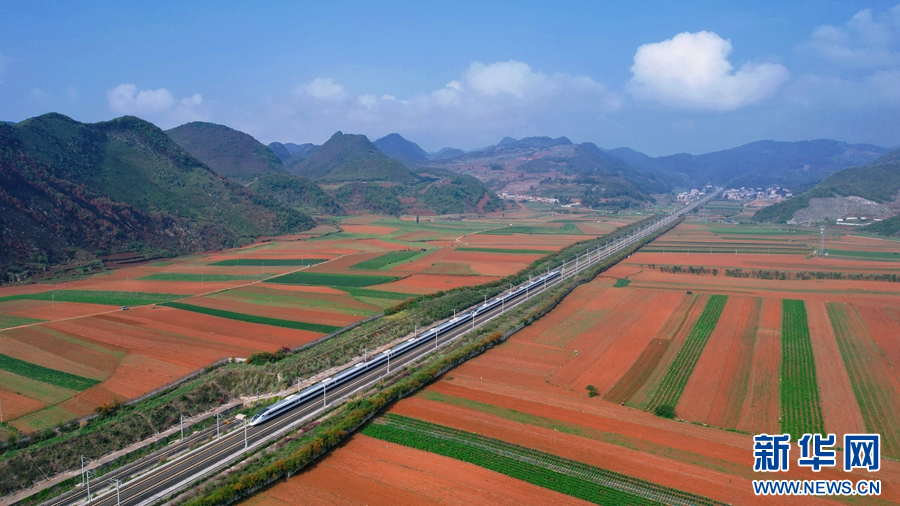 云南省文山州丘北縣,和諧號動車穿行在田野之中。
