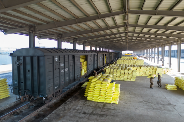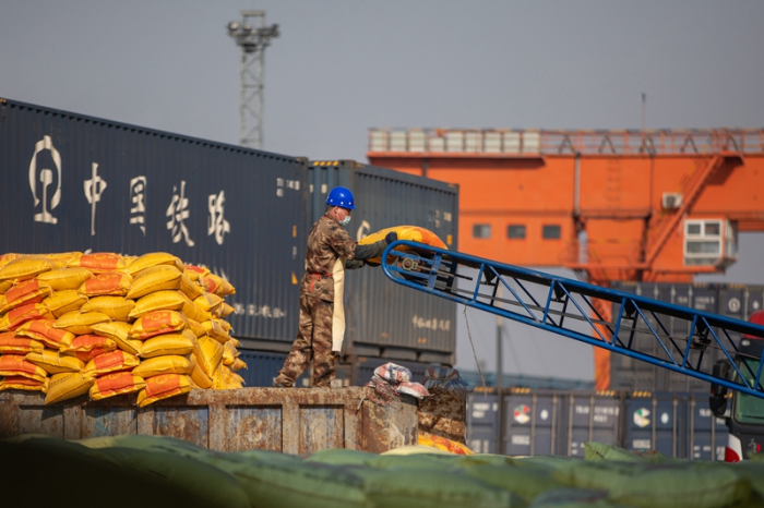 3月13日,在中國鐵路哈爾濱局集團有限公司大慶車務段肇東站貨場,工作人員在裝卸化肥。