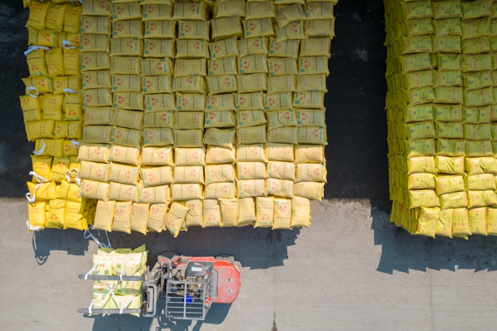 3月13日,在中國鐵路哈爾濱局集團有限公司大慶車務段肇東站貨場,工作人員用叉車運送化肥。