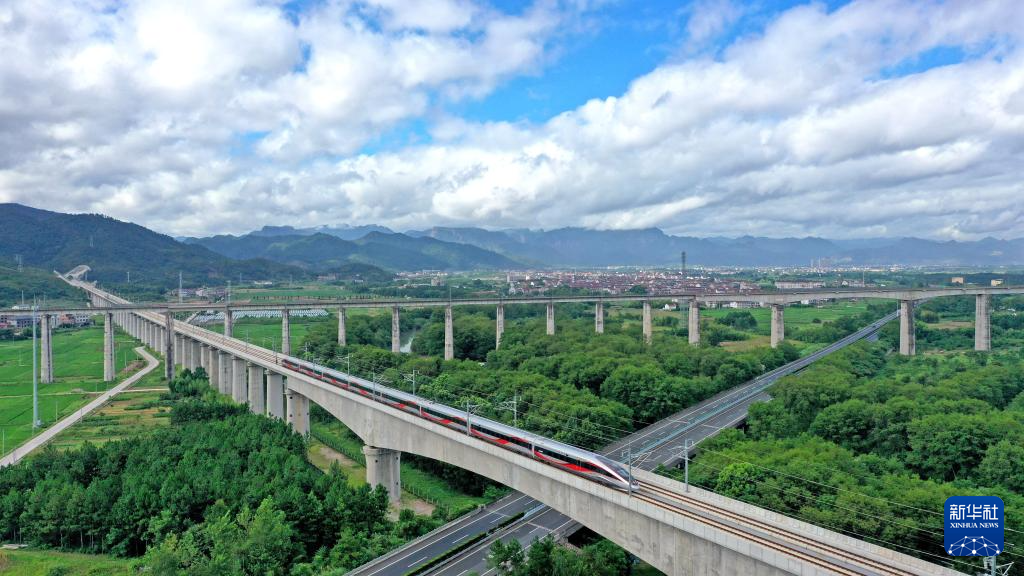 7月30日,一列動車組列車行駛在杭溫高鐵仙居段線路上。
