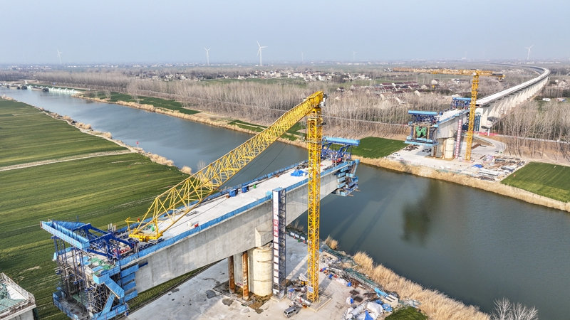 阜淮鐵路跨渦河特大橋連續(xù)梁施工現(xiàn)場。