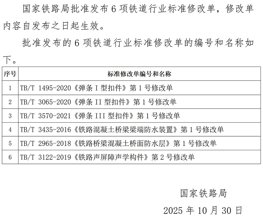 國家鐵路局批準發布TB/T 1495-2020《彈條I型扣件》(第1號修改單)等6項鐵道行業標準修改單。