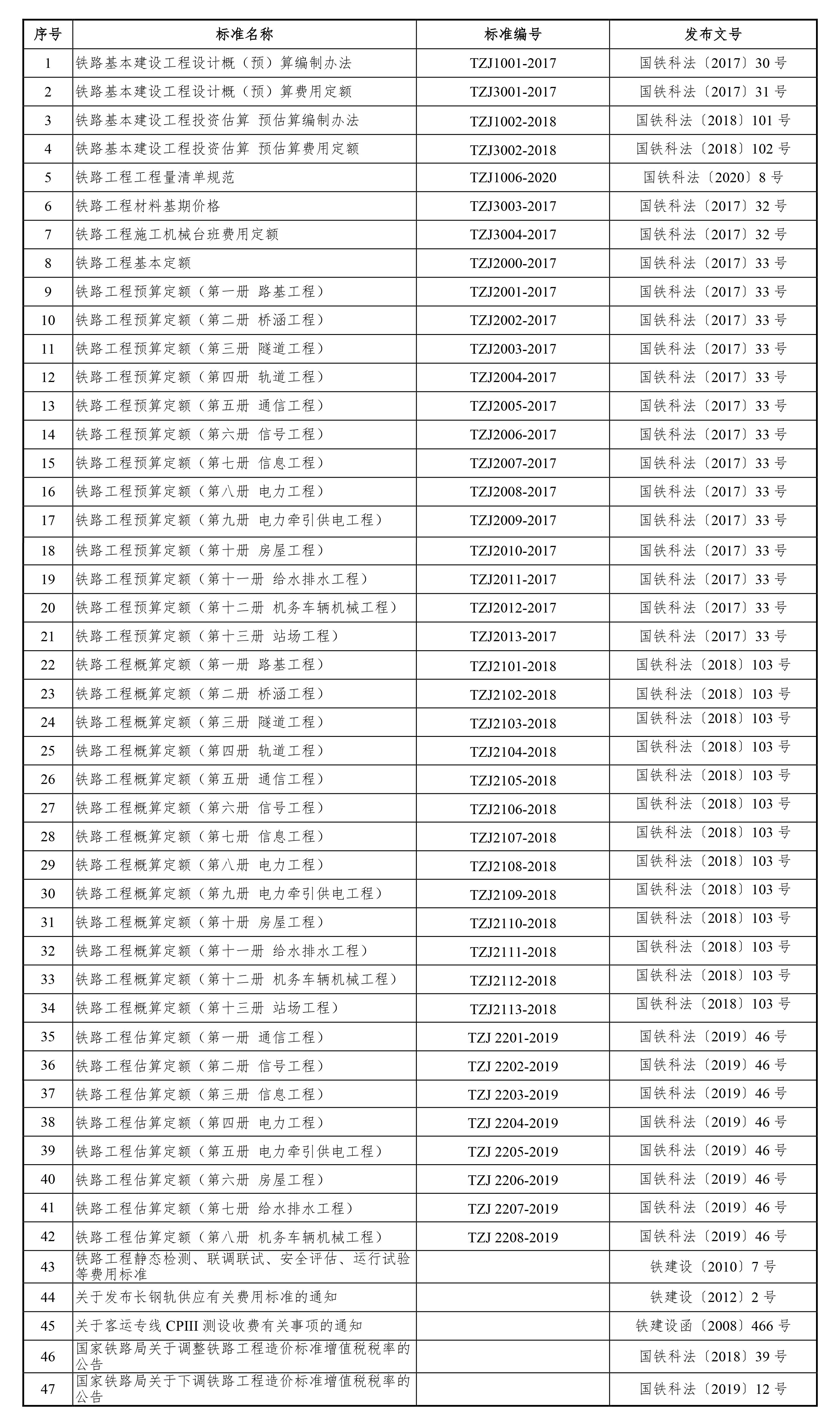 鐵路工程造價標準目錄(截至2020年3月31日)