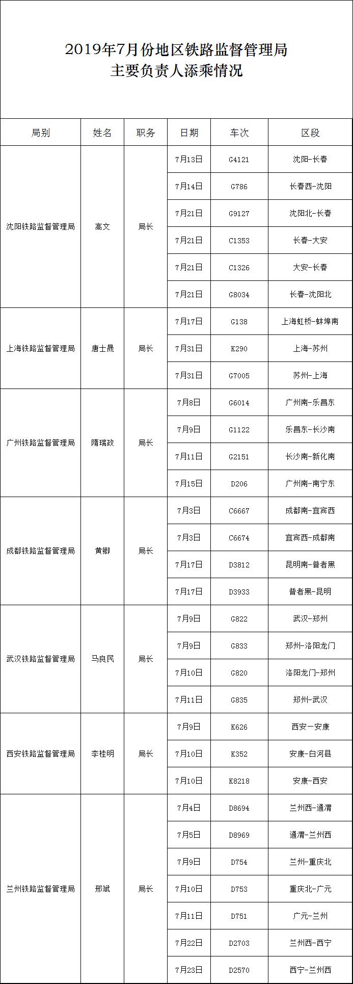 2019年7月份地區鐵路監督管理局主要負責人添乘情況