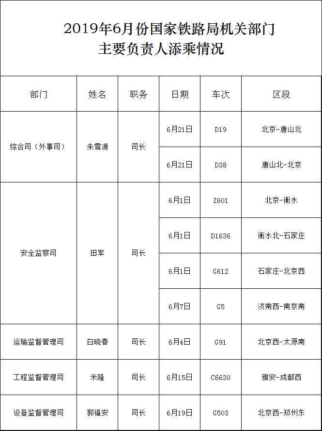 2019年6月份國家鐵路局機關部門主要負責人添乘情況
