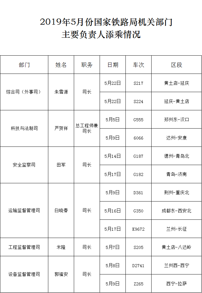 2019年5月份國(guó)家鐵路局機(jī)關(guān)部門主要負(fù)責(zé)人添乘情況