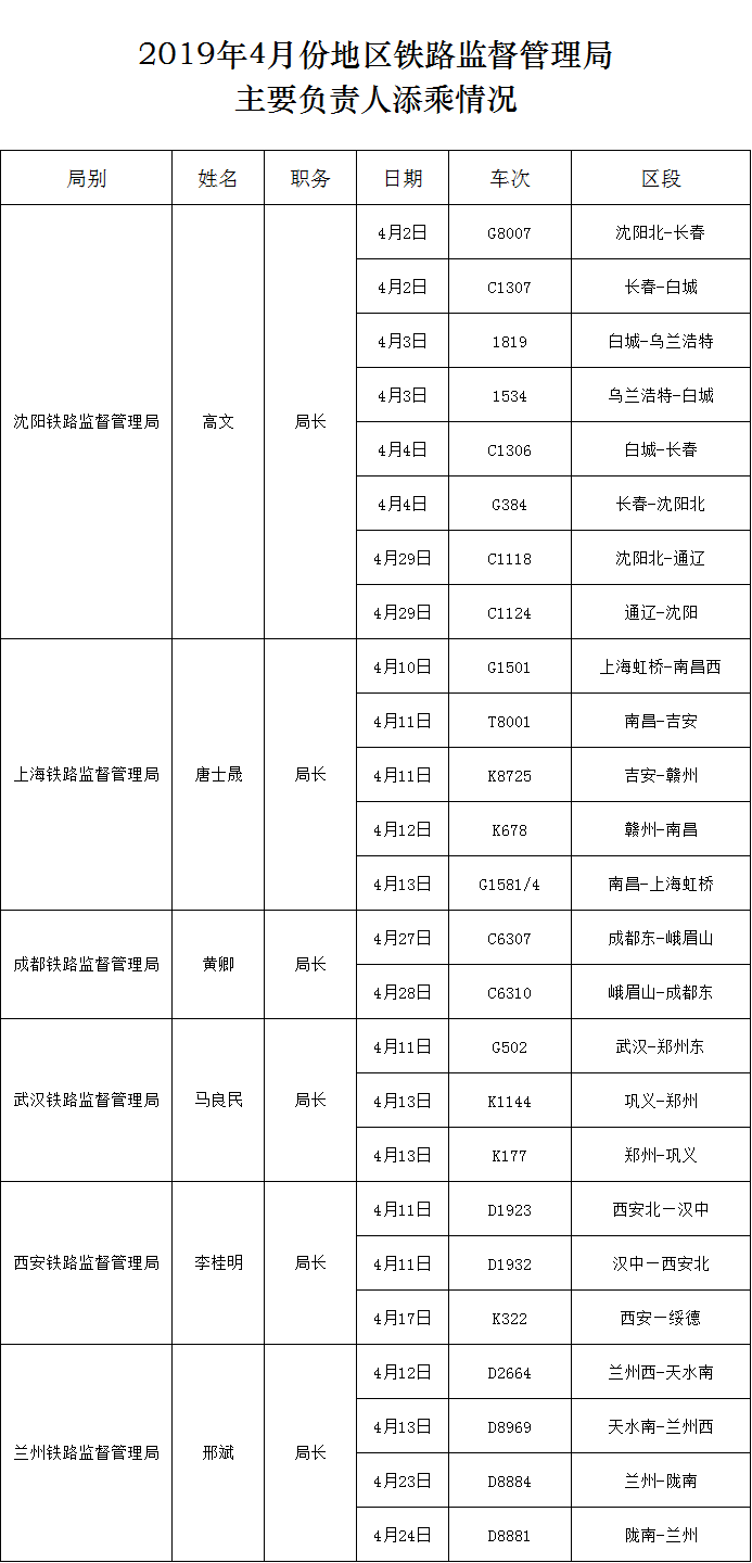 2019年4月份地區鐵路監督管理局主要負責人添乘情況
