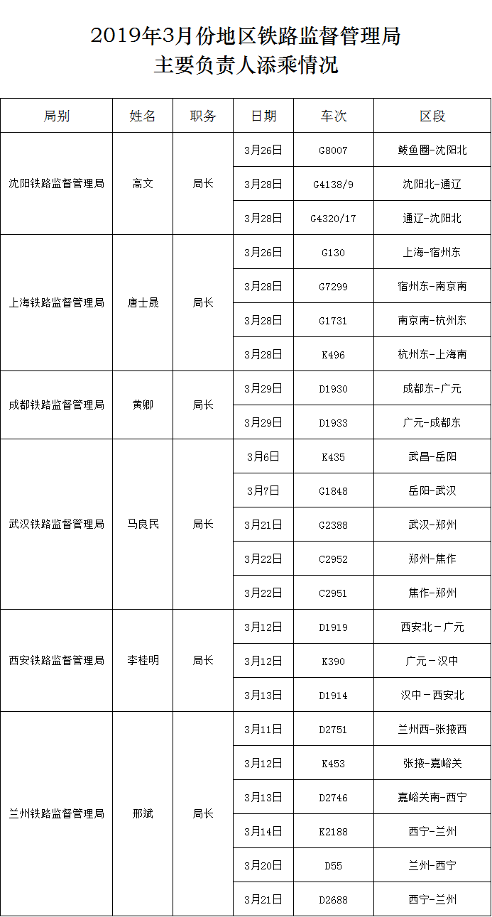 2019年3月份地區鐵路監督管理局主要負責人添乘情況