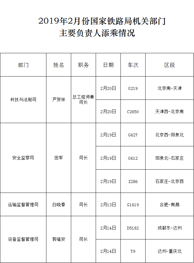2019年2月份國家鐵路局機關部門主要負責人添乘情況