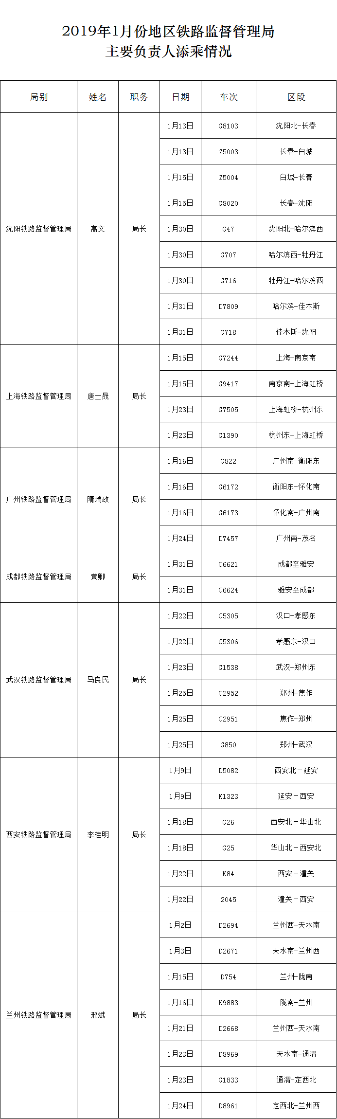 2019年1月份地區(qū)鐵路監(jiān)督管理局主要負責人添乘情況