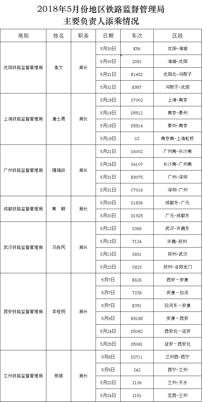 2018年5月份地區鐵路監督管理局主要負責人添乘情況