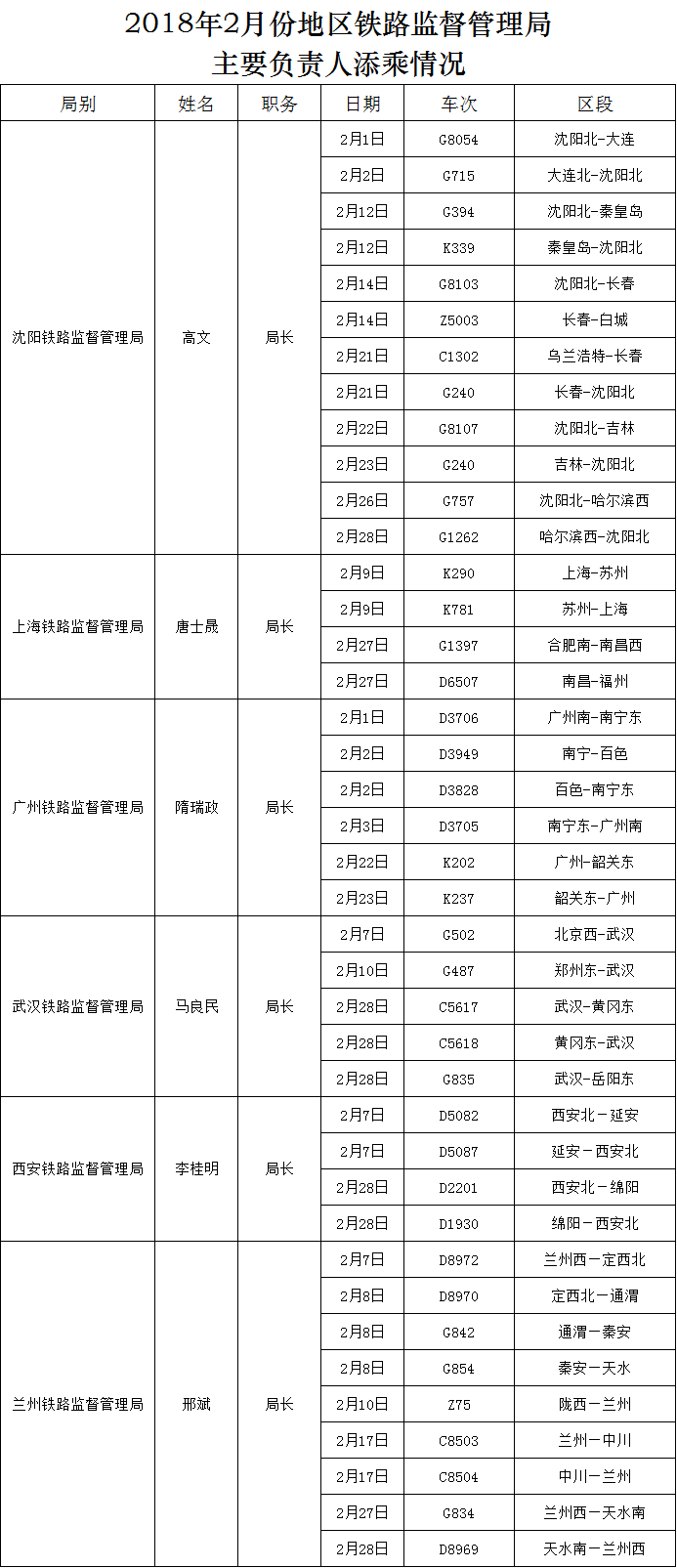 2018年2月份地區(qū)鐵路監(jiān)督管理局主要負責(zé)人添乘情況