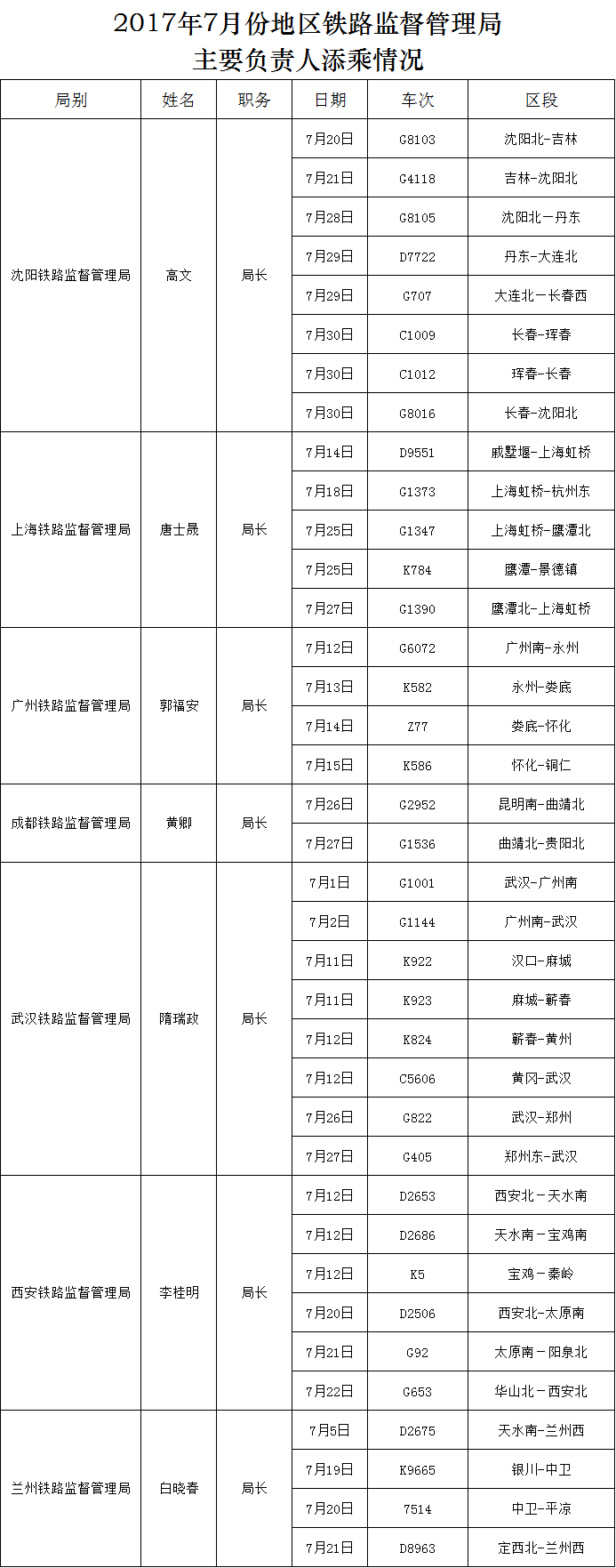 2017年7月份地區鐵路監督管理局主要負責人添乘情況