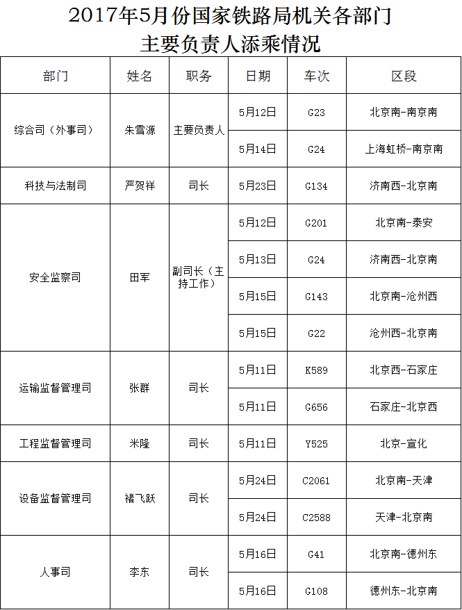2017年5月份國家鐵路局機關各部門主要負責人添乘情況